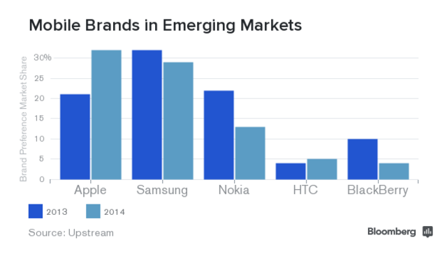 市场调查机构 Upstream 近日披露的调查结果表明,苹果是新兴市场消费者最想要的手机,去年的冠军三星滑落至第二,而诺基亚余威大减,位居第三。