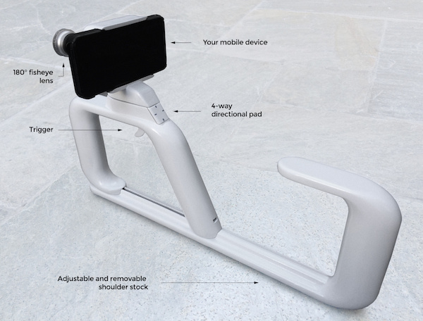 在目前 Kickstarter 的众筹中,13th Lab 展示了一个通过 Rescape 技术驱动的第一人称射击游戏。玩法非常简单,团队将一部 iPhone 架在一个类似枪支造型的支架上,利用 iPhone 摄像头将现实环境换算成一个虚拟的 3D 对战地图。通过手机的屏幕,你可以对画面中的一切射击,包括你的“敌人”。