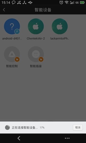 实际上,BroadLink 与小米路由之间的首次通信,需要通过小米路由 App 来进行。将 BroadLink 的红外遥控中心和 Wi-Fi 插座插在电源上,它们上面标志为“Wi-Fi”的灯就会不停闪烁,表明进入“连网”的状态。此时,打开小米路由 App,进入“智能设备”,点击“路由快连”,等待十多秒左右,就能够自动识别设备。