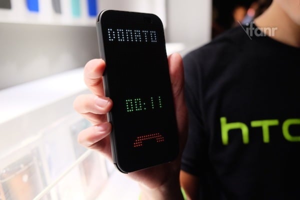 另外,HTC 还为 One M8 准备了名为 DotView 的保护套。该保护套的特点是在手机屏幕的 cover 上留有均匀的小孔,即使不打开保护套的情况下,也能通过小点组成的简单图案看到当前的时间或者来电。而且 One M8 内置了 Sensor Hub,因此在锁屏情况下只需要双击屏幕,就能出发 DotView 界面,既为用户提供了方便也一定程度上达到省电的目的。
