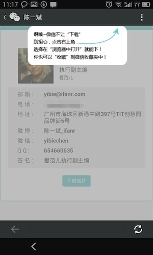 如果是 iPhone 这种不支持 NFC 功能的手机,又该怎么办?GalaCard 的左上方下方有一个二维码,就是针对这种情况而设计的:这时候,只要对方打开微信,扫描二维码,就能打开网络版的个人名片页面,跳转到浏览器打开,就能下载名片并导入到通讯录当中。