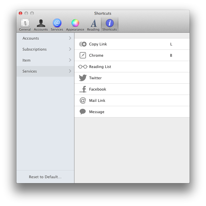 当然,手势纯属锦上添花,对我这种键盘党来说,完善的快捷键支持才是王道。在这方面,Reeder 2 for Mac 并没有太多可以挑刺的地方,你可以为各种操作定制自己熟悉的快捷键。