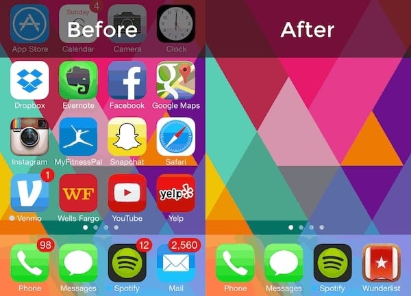 最后,这名开发者对自己的 iPhone 首屏进行了大扫除——仅保留最常用的电话、信息、音乐以及管理工具 Wunderlist,除此之外,整个首屏保留空白(如上图)。
