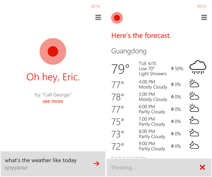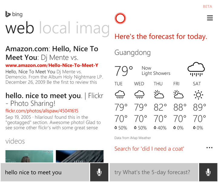 当我说的是“Hello,Nice to meet you”这样开放性的语句时, Cortana 展现的是 Bing 的搜索结果。问及“Did I need a Coat?”时,出现的结果也是天气预报。