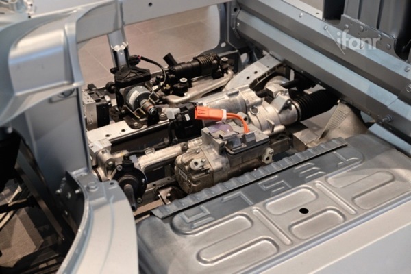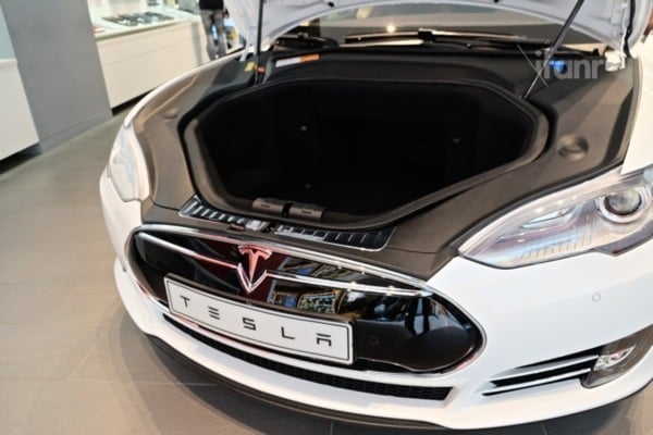 Model S 底盘,前方没有惯常的引擎,只有一只小小的高效电机