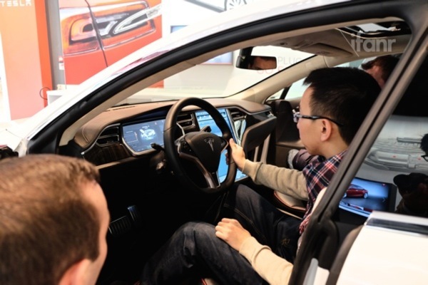 接下来就是真正的试驾了。提供试驾的 Tesla 位于商场负一楼的停车场,经过销售人员简单的示范后,Alex 同学便开始了试用。先从进入车门开始说起,和大多数高配置车一样,Model S 带有无匙进入系统,走进车子直接开门就可。另外自动伸缩门把也让这款车显得很有科技感。操作上,Tesla 采用的是类似奔驰的怀档换档,很优雅但需要一点时间适应。