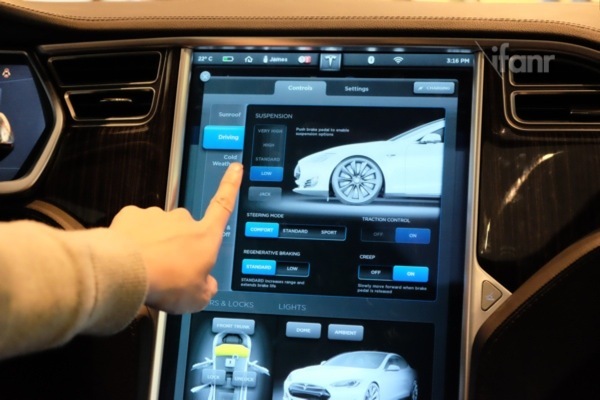 在试驾之前我们先体验了一下展示店的这辆纯白色顶配版 Model S。这辆 Model S 以 “大鹏展翅” 的姿态供人参观,由于纯电动车的关系,Models S 前前后箱均为中空。另外最吸引人的则要数这辆车上的全数字中控和仪表板。17″ 的触摸式中控确实如传闻中让人震撼,除了常规的速度、电量和地图等信息外,中控上的“系统”给人一种 iPad 的感觉,车辆的各种详细信息都可以查到,甚至连天窗、车门、行李箱、空气悬挂都是通过这块硕大的触控屏来控制,科技感十足。