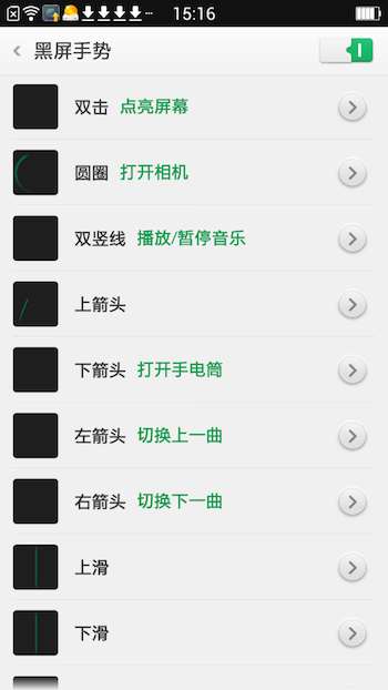 与 Color OS 1.0 时相比,黑屏手势以及全局手势板都有了相当多的改进,黑屏手势现在从原本的寥寥数个变成 13 个,还加入了自定义设置,在手机黑屏的状态下,可以双击唤醒屏幕,直接启动某个功能,打开某个应用——至少在我想抓拍的时候,可以直接打开拍照应用。