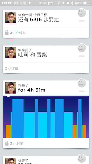 应用 UP 的主界面就是显示用户资料的综合页,包括运动、睡眠和饮食的各种指标和状态等等。往下拉即使按照时间先后顺序的动态更新,点击每一项都会有 UP24 数据的详细记录。