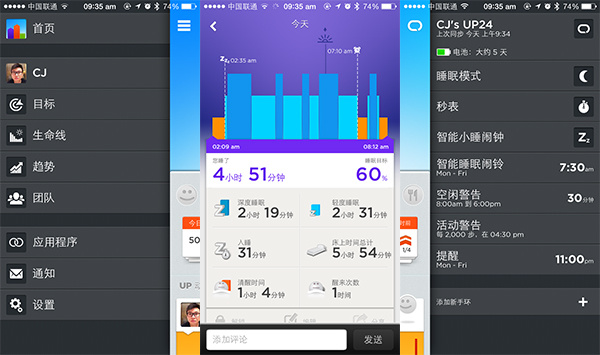 iPhone 安装了伴侣应用 “UP”后,仅需简单的步骤就能与 UP24 进行配对。用户需要在客户端上建立账号,,在使用过程中,UP24 仅充当感应器和临时的数据储存,每次打开应用后 UP24 的数据就会传送到手机,进而同步在云端上。