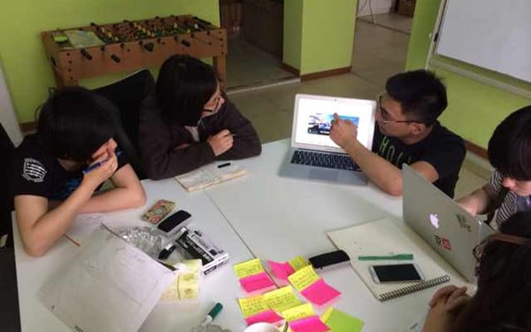 与玩途网站简洁的风格相反的是,玩途办公室的环境有些“乱糟糟”,每个人都埋头在两台显示器中,至少 5、6 块大型白板竖在不同的区域,上面密密麻麻地贴着各色贴纸。
