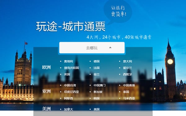 玩途就是在这样的背景下建立的一家专注发现海外目的地“地面服务”的创业公司,舍弃了传统旅行中的最主要部分,机票和酒店,而专注在了还相对小众的海外自由行市场。打开玩途的网站,首页只有简单的静态页面,和唯一的一个城市列表入口,尽管简单,但一眼就看懂了他们的业务,卖城市的门票、通票。在我们点击进入一个个城市页面后,发现了更多服务品类,门票、通票、交通、一日游。