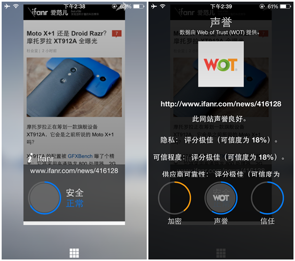 在多页面界面下滑某个页面后,会出现页面的安全信息,比如输入文本的加密程度,声誉状况和可信任度。像是需要填账号密码的邮箱界面,加密程度一般会比较高,而一般资讯类网页则显示加密程度较低,用户可以借此来判断网页是否安全,输入账号密码是否合适。