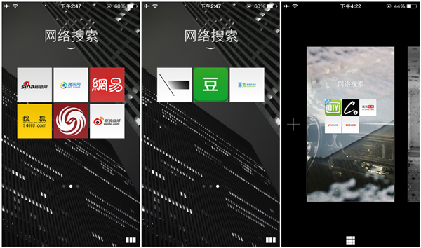 简洁是打开 Coast 的第一感觉,界面除了开始预置的几个门户网站和视频网站的图标之外,只有右下方的小按钮,以及上方的“网络搜索”四个字,完全没有任何多余的元素。每个页面最多有 3×3 一共 9 个网页书签,左右滑动切换页面,下滑唤出搜索框,可以进行搜索和地址输入。长按主界面空白处则是更换浏览器背景图片,也可导入手机相册图片。