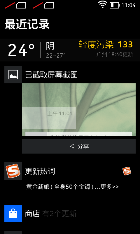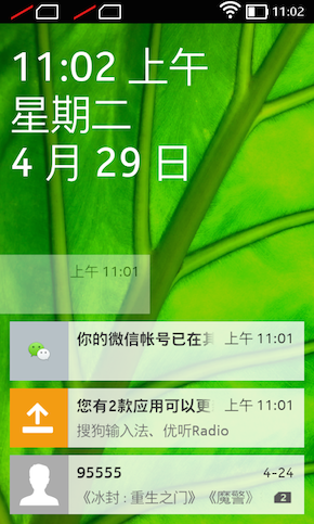 Nokia X 只有两屏,一个是主界面,另外一个是捷径界面——按住主界面左滑或右滑,就可进入捷径界面。这个界面里,这个手机上发生的所有事情,比如某个应用发出的通知,十分钟前拍下的照片,五分钟前打过的电话,都会显示在上面。它也不仅仅提供一个入口,比如说,如果是未接来电,我们可以直接在捷径界面下,选择回拨;未回复回复短信的下方,也提供了直接回复的按钮。