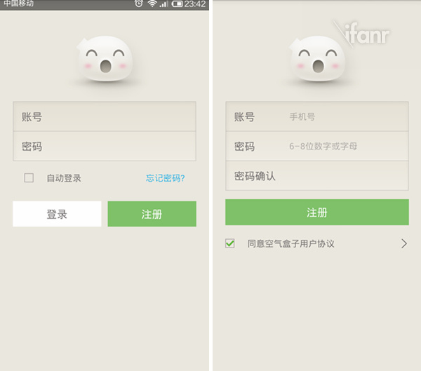 打开“空气盒子”应用后,系统就会进入登录界面。初次使用的用户,首先要注册空气盒子的账号,用于记录和同步个人数据。注册的账号必须是手机号。