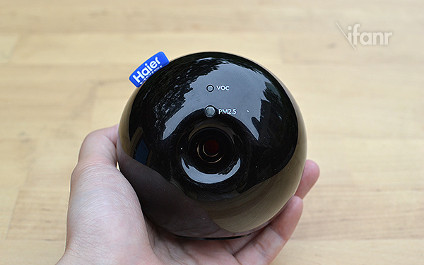 尽管被称为“盒子”,但海尔空气盒子采用的却是圆形的球体设计。盒子中部是一个贯通的传感器窗口,用来收集空气样本,周身则采用黑色材质,顶部蓝色的海尔标签在黑色机身的映衬下格外醒目。