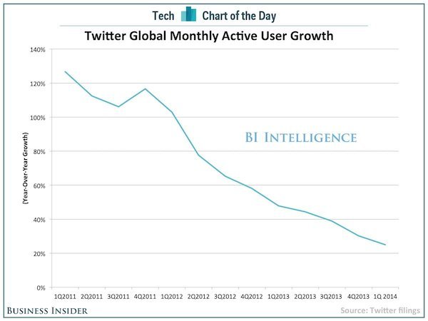 而且虽然相比同期,第一季度的月活跃用户呈现出 25% 的增长,但是去年第三和第四季度,这个数字则为 39% 和 30%。 简单来说,Twitter 的增长正在放缓(如下图)。