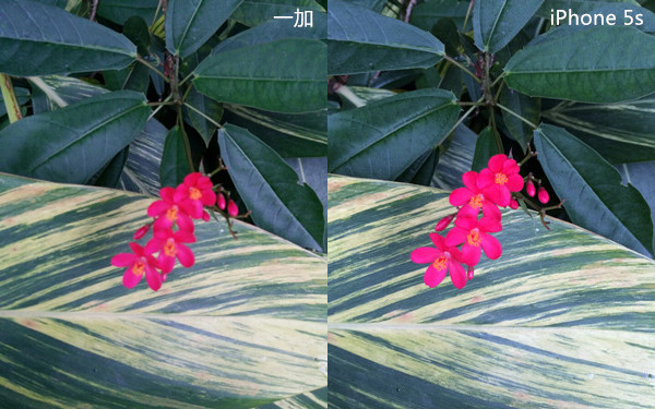 那么,刘作虎所说的“更加准确的白平衡”实现得如何呢?只有拿样张出来说话了。下图是阴天没有其他光源的照片,可以看到,在绿叶部分,两款手机的样张表现几乎一样,红花部分,iPhone 5s 显得过于艳丽。事实上,一加手机在这个时候的还原甚至更为准确一些。