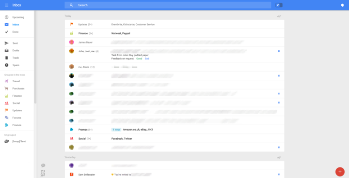 主界面变成这样,取消三栏设计,顶部导航栏的搜索框变得更加长而突出,邮件列表分成 Today 和 Yesterday 两部分,可以查看自己有哪些邮件没处理完。新版 Gmail 采用了抽屉式导航设计,导航栏左上角的 Inbox 与左侧导航栏的 Inbox 有相互呼应的关系。