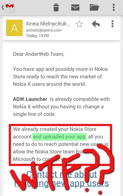 未经允许私自上传应用?诺基亚应用商店的出格行为遭到了 ADW Launcher 开发团队的一致指责,韦布斯用红框标注出邮件中的这段话语,然后在一旁写上硕大的 “WTF” 以示抗议。