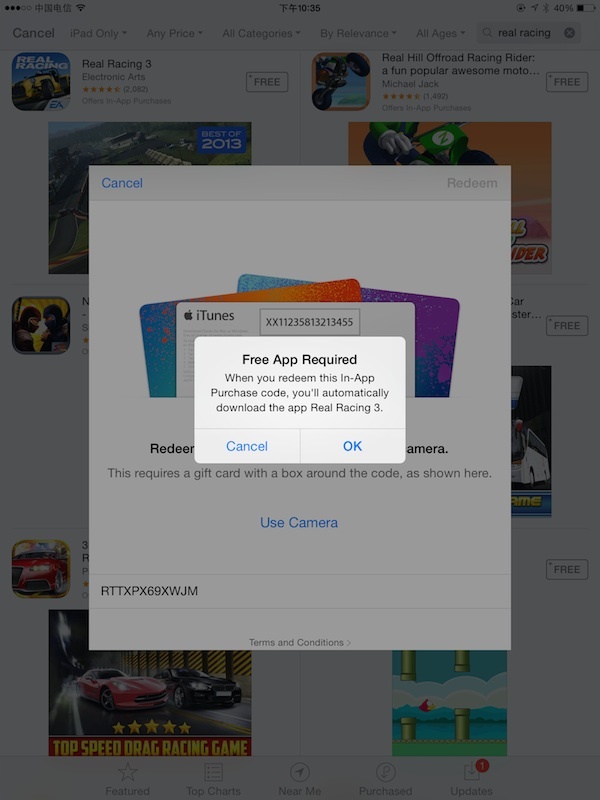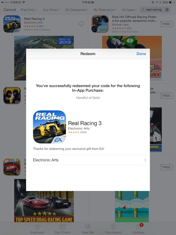 不过情况总算有些变化,苗头出现在游戏厂商 EA 在美区的 Real Racing 3 推广活动上。只要用 iOS 设备访问这个活动链接并点击“Redeem”按钮,就能获得 Real Racing 3 内购项目的推广码。注:需要美国代理及 App Store 美区账号。