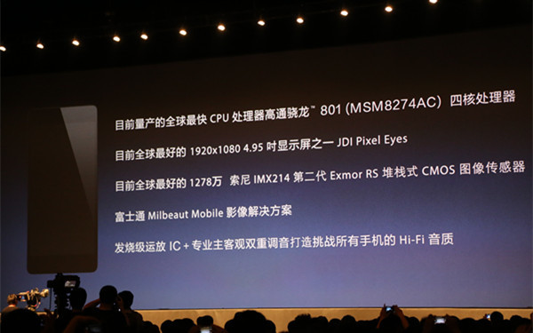 和许多发布会一样,开始讲解的是手机硬件。虽然老罗并不强调配置,但是在锤子 T1 硬件上并不含糊,骁龙 801 处理器,JDI 1080p 4.95 英寸屏幕(445 ppi),1278 万像素 f/2.0 光圈索尼摄像头(堆栈式传感器)都算是业界顶尖。