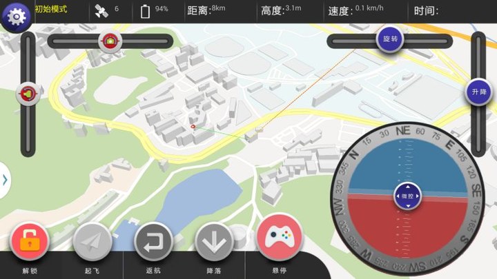 通过配套应用,我们还可以直接操作 Ghost 升降,以及应用界面右下方的圆盘细微调整无人机的在空中的位置;配套应用还详细显示了当前飞机飞行的高度、距离以及连上了多少 GPS 卫星。