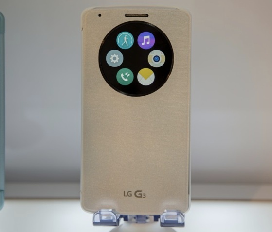G3 的保护套也别具特色,被命名为“QuickCircle”。保护套上挖了个大圆孔,套在手机上,能够显示相机、音乐等小应用,还能显示拨入电话和短信。