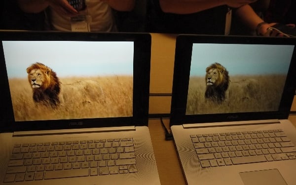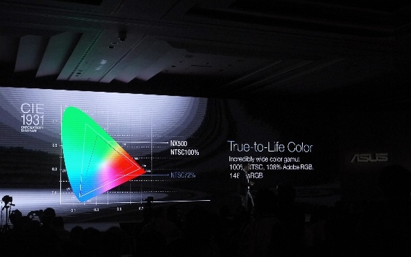 华硕一直以来都是 4K 技术的积极推动者之一,这块 4K 屏幕不仅仅是分辨率大跃进,更是拥有超广色域(100% NTSC,108%Adobe RGB),画面表现力极佳,下图就是普通 72% 色域的显示屏与华硕 Zenbook NX500 的对比,差距一眼便知。