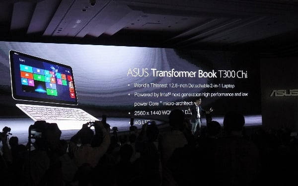 Transformer Book T300 Chi 整体机身最厚处为 14.3 mm,若是去掉键盘部分仅作平板使用,其厚度仅有 7.3 mm,是同类产品中的最薄,据称会使用英特尔下一代酷睿芯片,采用无风扇设计,续航和散热表现值得期待。