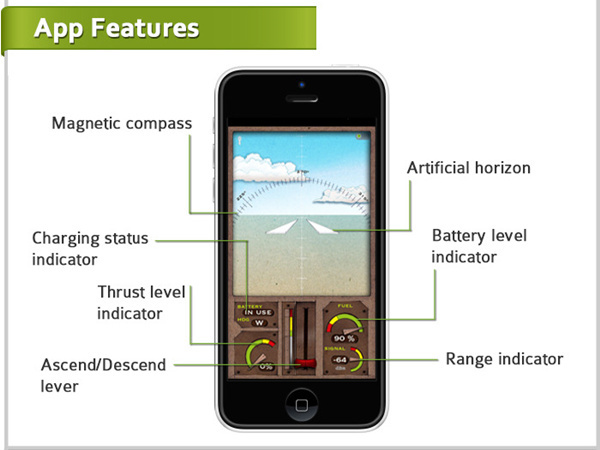 手机端的遥控应用设计也很怀旧,包括了使用油门杆提升/下降、重力感应提供左右变向、电量指示、距离水平方向指示等等。