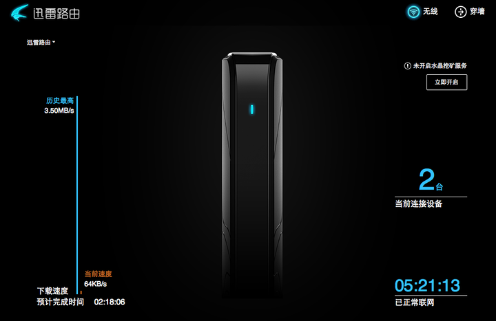 它没有强调路由器在智能家居的“中心”地位,而是加强路由器的远程下载能力,以“云”为中心,提出“水晶挖矿”的新玩法。就让我们来体验一下这款特别的迅雷路由。