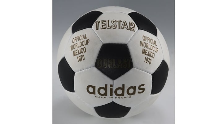 1970 的这款世界杯用球名为 TelStar,中文名为泰事达,同时这也是一颗通讯卫星的名字。它的表面由 32 块手缝的嵌面组成,其中有 12 块黑色五角形和 20 块白色的六角形,这种全新的构造配合均衡的缝制使足球拥有更圆更完美的外形,也奠定了足球的经典外观。