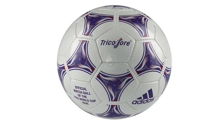 98 年的法国世界杯用球首次有了彩色的元素,灵感来源则是法国国旗的蓝白红三色,图案是高卢雄鸡。那年世界杯,法国在主场夺冠。那年也是我首次关注世界杯,齐达内封王之前,欧文一战成名。