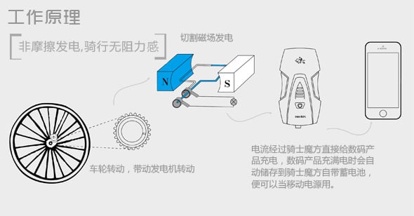 好啦,很多时候其实没这么严重啦。不过在外骑行,电力真的是一个问题。那么魔方骑士可能属于你会需要的产品——它是一款专门为骑行爱好者研发的自行车发电移动设备,由发电机和主机两部分组成。发电机安装在车轮,而脚踏的过程则会制造电能,储蓄在主机里。而主机同时还是配备了高亮 LED 灯电筒(五档强度调节),方便骑车一族的夜间安全出行。