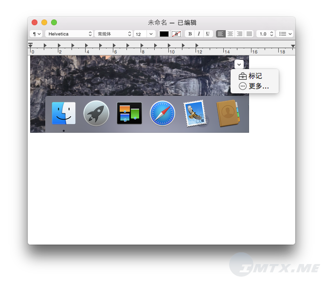 这时我想给这张图片加一行文字标记,而不是回到源文件用其他 App 去编辑它。只需要很简单:把鼠标移到图片上,会冒出一个下拉点击区域,点击它,就会出来:标记。这就是和 Mail.app 一样的功能。