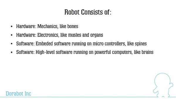 张浩这张幻灯片解释得很清楚,机器人其实分为三个部分:机械、电子、软件。其中,机械的作用就好像骨头,电子部分就好像人体的肌肉和器官,而软件部分就好像我们的神经系统。不过,软件部分也分为两种,一种是嵌入式软件,它的作用就好像我们的脊椎,或者是植物性神经系统,能够让我们作出基本的反映;另一种高级软件,往往运行在单独的笔记本电脑上,它的作用就好像大脑,进行复杂的决策。