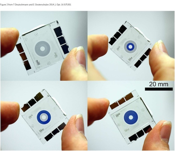 不过随着科技的发展,移动设备上的微型镜组也很快能拥有调节光圈的能力了。德国凯撒斯劳滕工业大学最新研制出一种能能够智能调节进光量的玻璃,这种玻璃上有一层遇电变色材料(下图),工作原理就像人眼的虹膜一样,能够根据需要调节进入感光元件的光量。