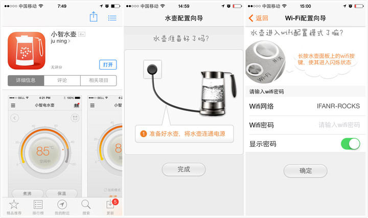 先不考虑其物联功能,即使作为一款普通电水壶,从材料,电子原件,到生产工艺,“小智”集合了很多电水壶的优点。在智能方面,“小智”对应的App,带来了很多超值的功能。如微沸除氯,预约用水,智能匹配各种不同的热饮如奶粉,茶叶,咖啡等等。解决了婴儿夜奶的用水需求,以及咖啡客和茶客对精确温度的要求。