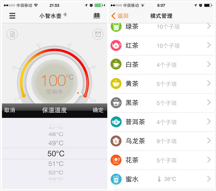 如果你是咖啡爱好者或者是茶控,那“小智”智能水壶的精确控温功能应该能吸引你。碧螺春需要 75℃,西湖龙井 85℃,茉莉花茶90℃……想要泡出味道最正的茶,又不想拿着温度计在一旁测量,小智的精确控温功能就显现出来了。