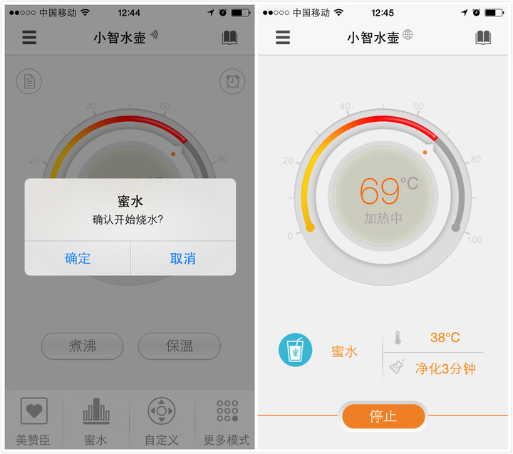 我们选择了“蜜水”来试用,在模式管理中选择“蜜水”选项,可以看到其已内置目标温度 38℃,净化时间 3 分钟,所以只用点击“确定”烧水,就能得到一壶 38℃ 的水,用来冲泡蜂蜜。