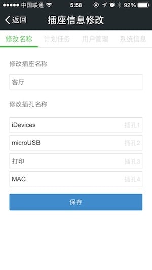 用微信扫描插座屏幕的二维码进入微插座专门的服务号后,除了能够获取在线说明书和社区入口,你还能够在微信中对微插座进行设置。只要微插座在联网,无论你身在何处都能在手机微信上控制四个插座的单独开、关,制定用电计划。在微信上你还能为不止一个微插座进行管理,后台系统做得非常易用和稳定,你能够对多个微插座进行命名管理(比如客厅、睡房等)。