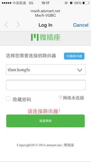 方法非常简单,微插座接通电源后,机身正面的 LCD 显示屏就会提示连接网络。用手机连接到微插座的 SSID,就会自动在手机上弹出设置界面。再需要你花一分钟在手机上进行简单设置,微插座就能连接到你家中的 WiFi 路由上。这时候插座上的屏幕会自动显示当前时间,其实代表插座已经接入了互联网。