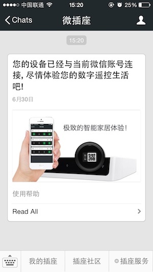 不过相信最终让你埋单的,可能还是微插座第三个卖点——微信接入。对,现在相信你已明白微插座这个 “微” 的含义了。这是一款微信硬件,所以当插座接入了家庭 WiFi 后,不仅仅充当了 WiFi 信号拓展器,还顺便实现了与微信后台的通讯。