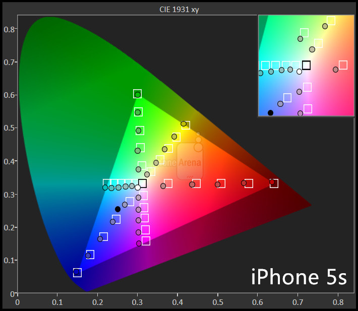 这一点应该算是屏幕素质中权重最高的一部分,也是三星屏幕永远的痛,此前三星 S5 屏幕评测中被广泛提到的是 100% NTSC 广色域,但对色准提及甚少。而 iPhone 5s 的屏幕的色域偏窄,但是胜在色彩还原十分精准。