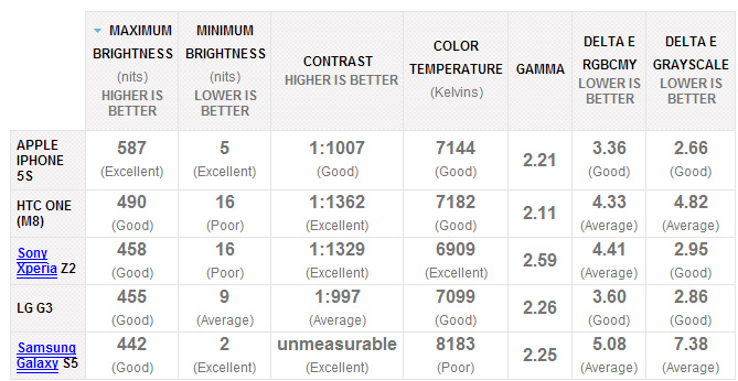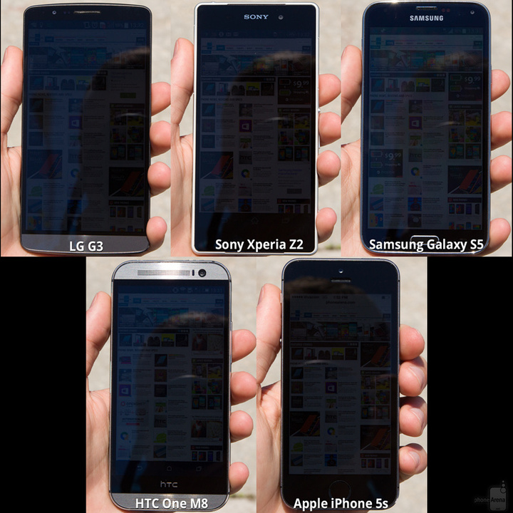 按照 phonearena 最终评分,iPhone 5s、HTC One (M8)和 Xperia Z2 最终平均分都为 8.16,LG G3 屏幕的得分是 8 分,而三星 S5 则为 7.33 分。