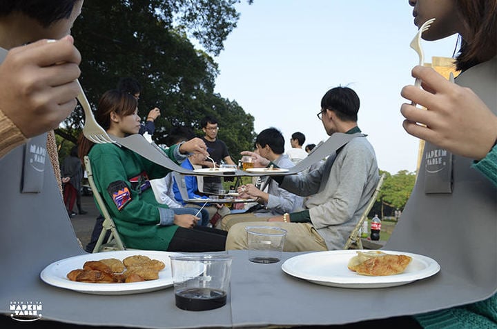 不得不说,这样用餐的画面实在太美,让人不忍直视……不过,也许这是一种全新的用餐体验:“现在越来越多的人沉迷手机,这启发我考虑到底什么样的聚餐是理想的,如何才能创造一个全新的用餐体验,来让我们更多的关注彼此。”Napkin Table 的发明者 Michael Jan 说。她现在在台湾东海大学读工业设计。