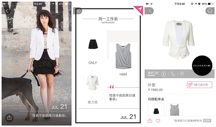 选中点击进入自己心仪的搭配后,会出现搭配衣物详细的品牌信息,以及为什么如此搭配的简短时尚理由。进一步点击衣物,便是衣物更详细的信息,包括具体名称和价格,哪里有卖有打折。即使是品牌的 Logo 也是一个入口,点击进入可以了解该品牌的本季主打,当下折扣信息,更进一步的则是线下店的地理指引信息了。