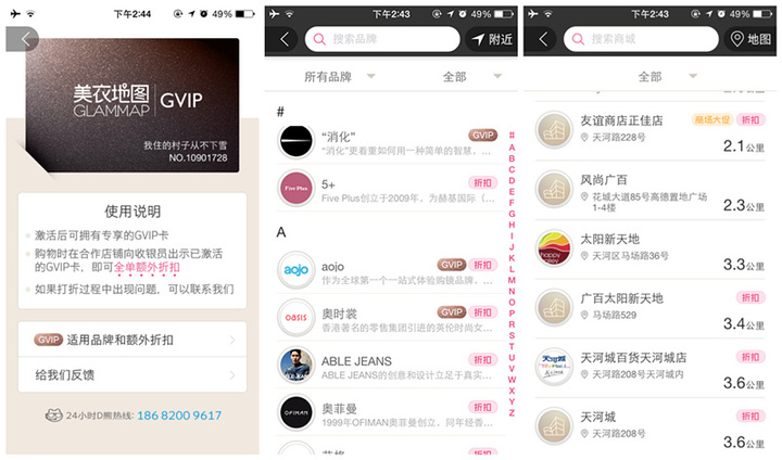 因为定位于快消时尚和中端时尚市场,并且面对的是年轻女性,这个群体有着很强的消费意愿,但是消费能力并不见得很强,于是打折成了一个准刚性需求,这也是美衣地图着重在做的。这方面,美衣地图提供了 GVIP 的折扣卡,在指定门店出示这张虚拟 贵宾卡便可以享受相应的额外折上折。